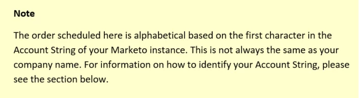 The changes being made will be staggered over 6 months in order to ensure we don’t cause any traffic jams while passing data back and forth. The best way to schedule this is to go in alphabetical order. This order will be alphabetically by your Marketo instance’s Account String, not your company name. Please check the section below for how to find your Account String.