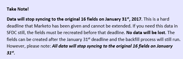 The configuration changes being made will require customers to recreate some fields if they want to still use that data within SFDC. Once the fields are recreated, the backfill process begins, which in turn starts a global resync of all leads from SFDC to Marketo. This will push a lot of data between Marketo and SFDC. To minimize the risk of a traffic jam, we will be scheduling this roll out over the course of 6 months. This gives all customers a set time frame to work with and helps to avoid peaks in traffic. If the time scheduled for you doesn’t work out, we’ll try to accommodate another time within this six month timeframe that does work well for you.