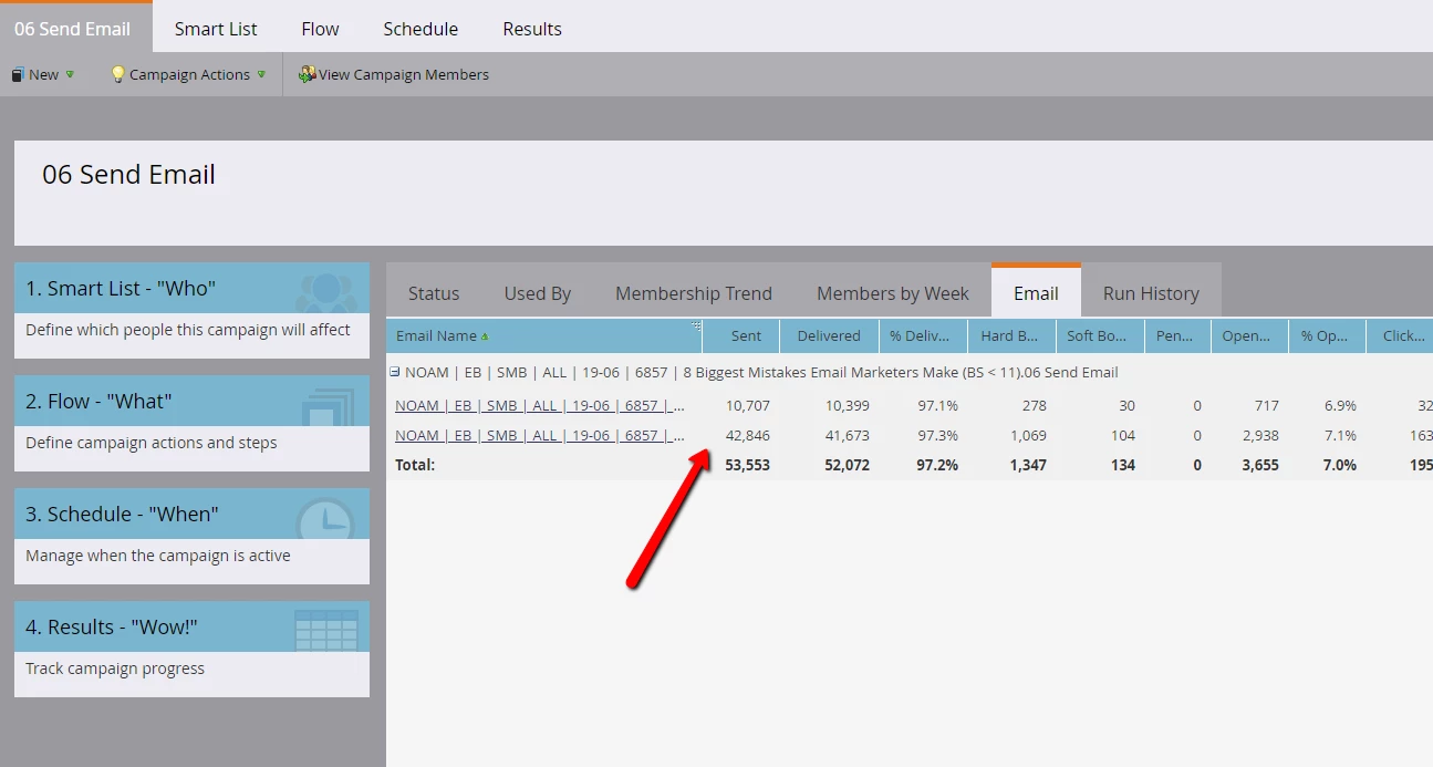 e. Navigate to the smart campaign and Click on the Email tab to confirm that more than 2,000 leads were sent the email.
