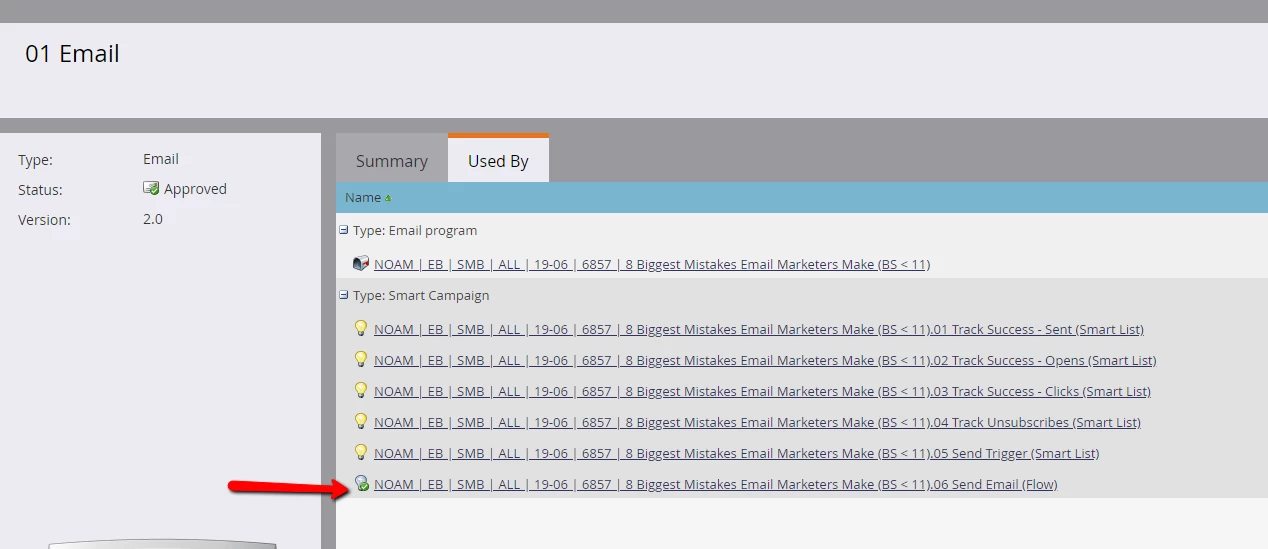 d. Locate the email in question and click on the Used By tab to identify the campaign(s) that were used to send this email. In addition, please ensure that this is a non-operational email (operational emails were NOT affected by this issue).