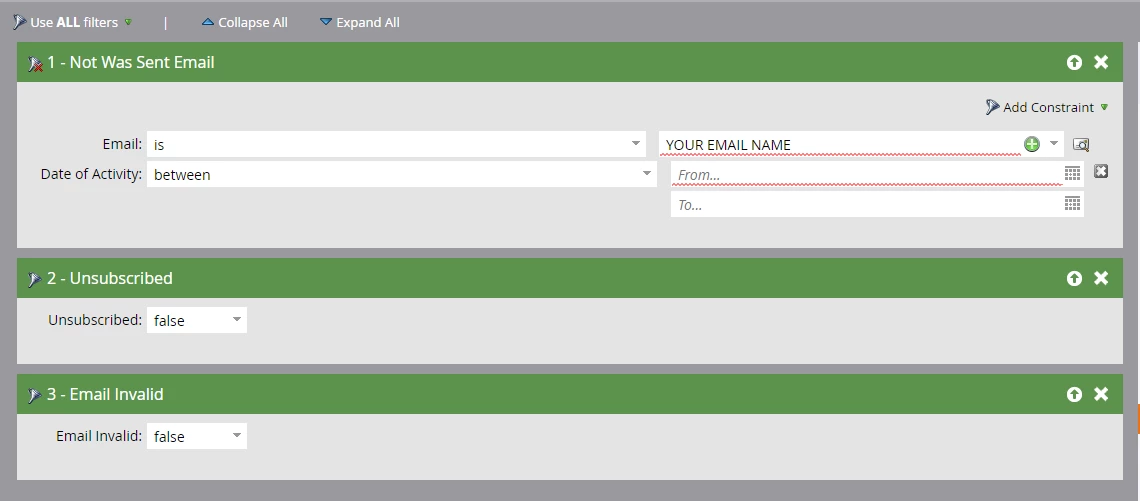 For important Email Programs and Smart Campaigns that were impacted, you can create a new Smart Campaign to determine which leads did not receive emails that should have. To do so, use the smart list conditions as shown below.