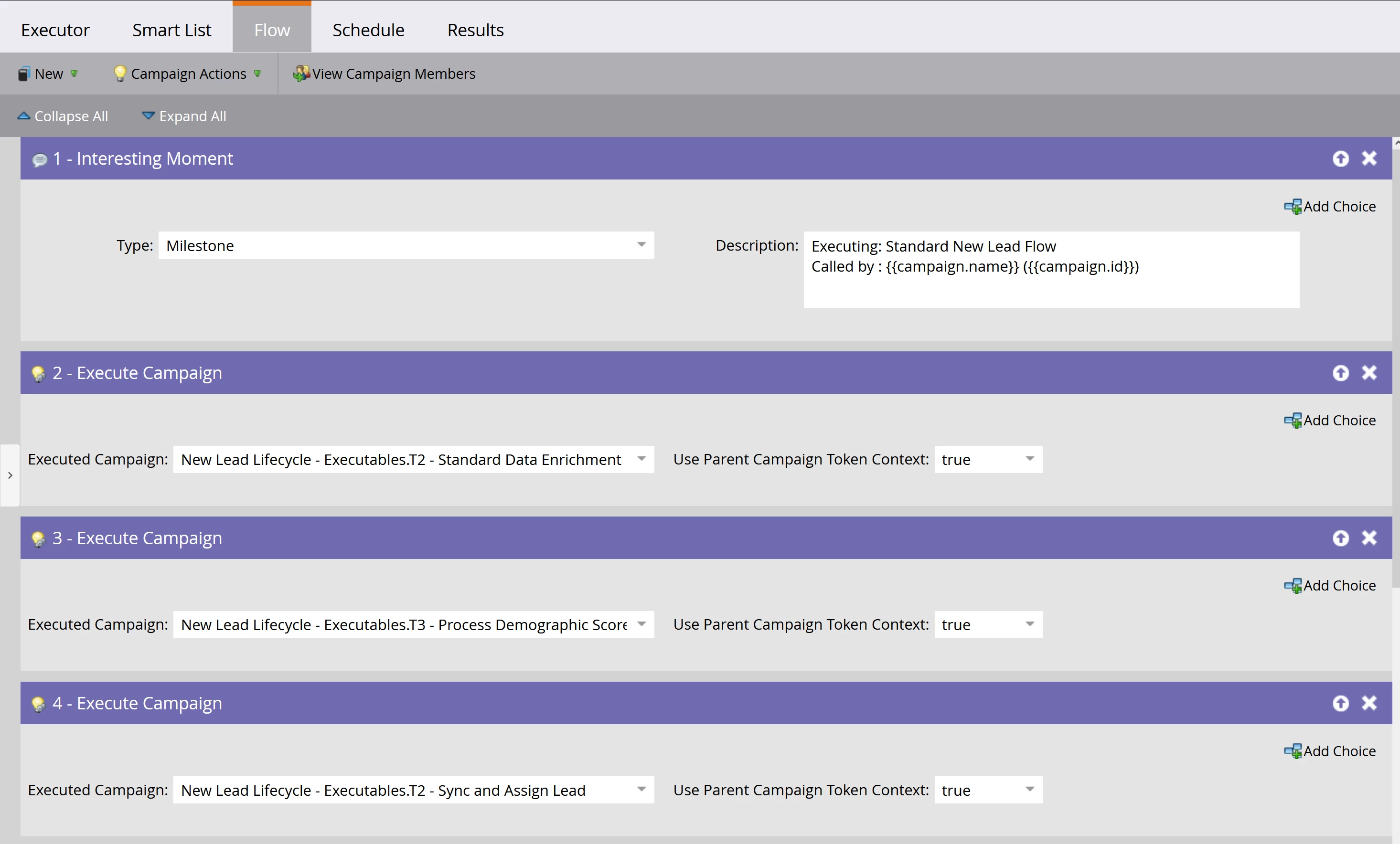 You may find that your business does not need to use Tier 1 campaigns, and that you can satisfy your organizational needs with just Tier 2 & 3 campaigns. However, Tier 1 campaigns allow an additional layer of flexibility for you to manage your campaigns. Typically, one of these campaigns will call a mix of individual flow steps, and Tier 2 & 3 campaigns to assemble a flow for a typical lifecycle event, like a Standard New Lead Flow. These typically include data enrichment, normalization, scoring, and routing flows, which can be created as tier 2 or 3 campaigns.