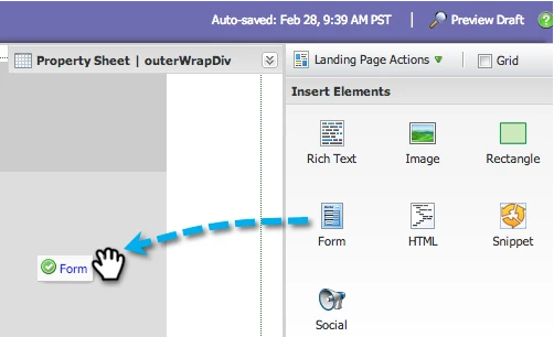 The landing page designer opens in a new window.2. Drag over the Form element.