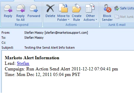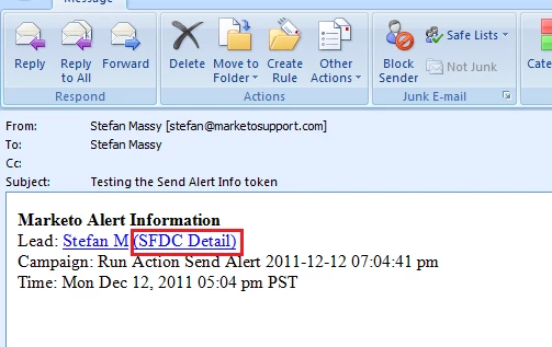 Below is what the generated alert looks like once it is sent from Marketo (note the link to the Salesforce detail page is automatically inserted):