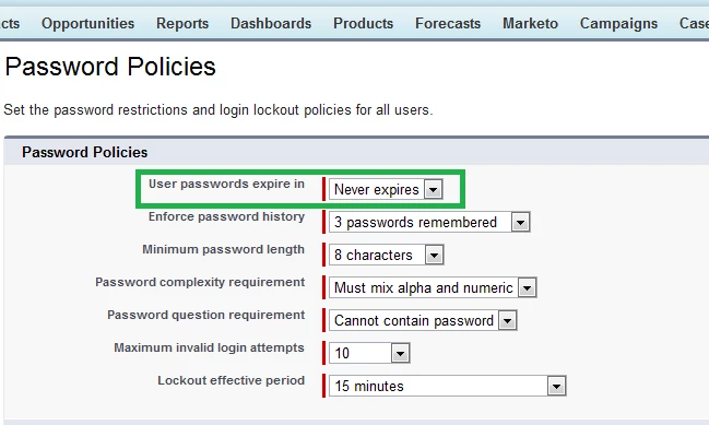To permanently fix this issue, you will need to change the password policies in Salesforce so that your password never expires in Salesforce. To do this, in Salesforce, go to Setup -> Administration Setup -> Security Controls -> Password Policies -> User passwords expire in -> Never expires -> Save for your "your_sync_user@domain.com" user in Salesforce: