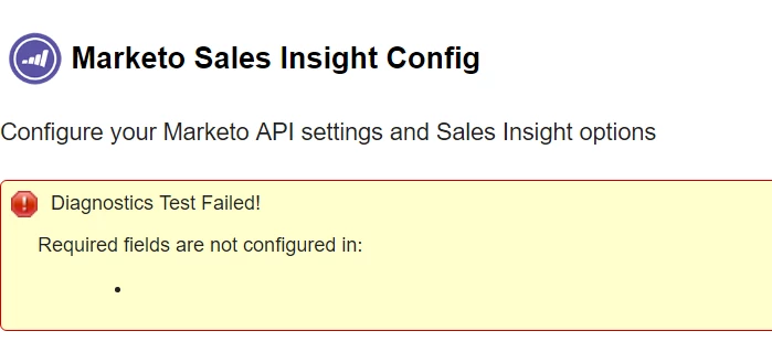 If you tried to Verify the Setup and Configuration of Marketo Sales Insight via the Sales Insight tab in the Admin section of Marketo Lead Management, and the MSI Status wasConfiguration Problem, a configuration error in your Marketo Sales Insight setup was detected, meaning that one or more of the required fields/objects for synchronization were not properly configured in Salesforce.