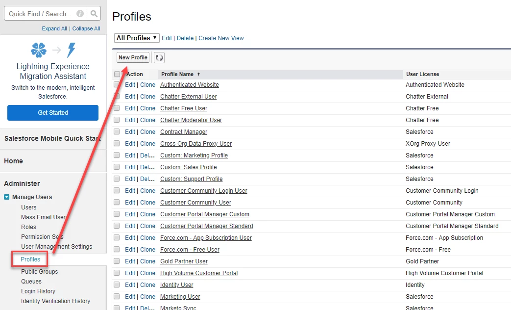 If you have a dedicated profile for your Sales Insight users, you can skip this step.Otherwise, you should create a new one now. Go to the Setup page and pick Administration Setup -> Manage Users -> Profiles in the menu. Then click the New button at the top of the page: