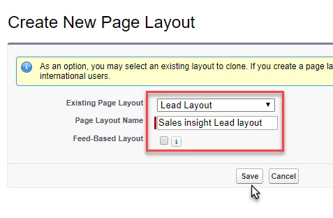 Next, you'll need to create a new view for your Sales Insight profile. These instructions describe how to set up the Lead page; repeat the steps to set up your Contact, Opportunity, and Account page layouts.Go to the Setup page, then pick App Setup -> Customize -> Leads -> Page Layouts and click the New button.