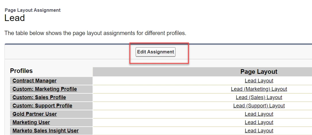 Follow the instructions in the Installation guide for configuring the lead detail page.Installing the Marketo Sales Insight AppExchange packageGo back to the Page Layouts section and click the Page Layout Assignment button.