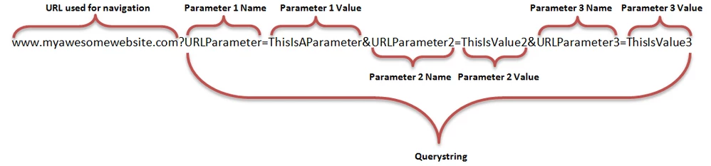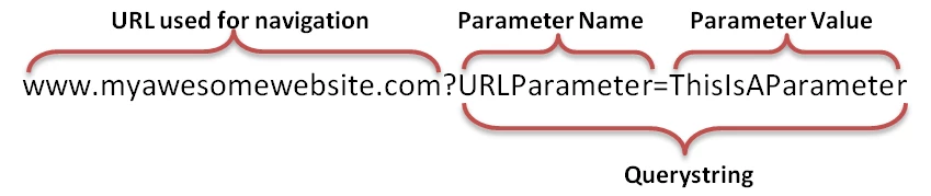 The first part of the URL, “myawesomewebsite.com” is the main part of the URL used for navigation. The whole rest of the URL from the question mark on, “?URLParameter=ThisIsAParameter” is referred to as a querystring. It isn’t needed for navigation to the page specified, but can be used to pass the extra data you want to include.