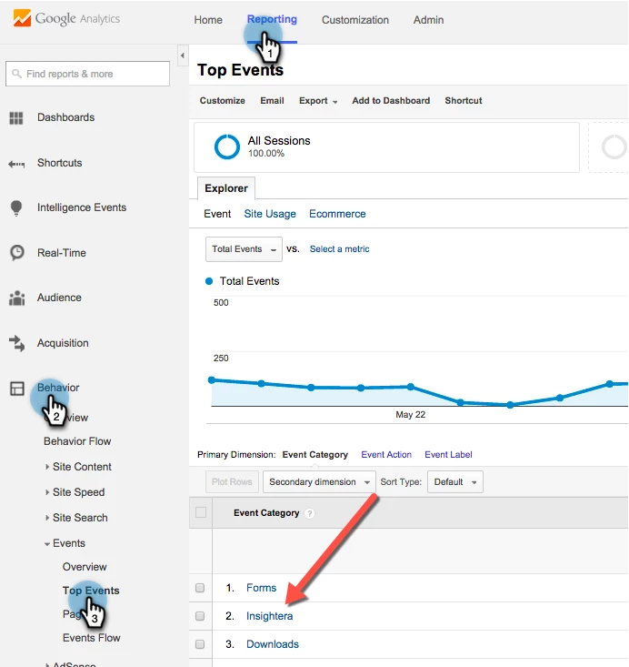 Log in to GA and navigate to Reporting > Behavior > Events > Top Events