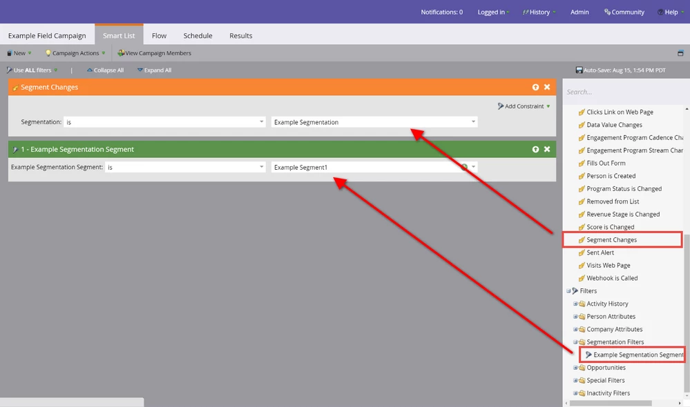 In the Smart List tab, choose the filter for your desired segmentation, and the Segment Changes trigger for the same segmentation
