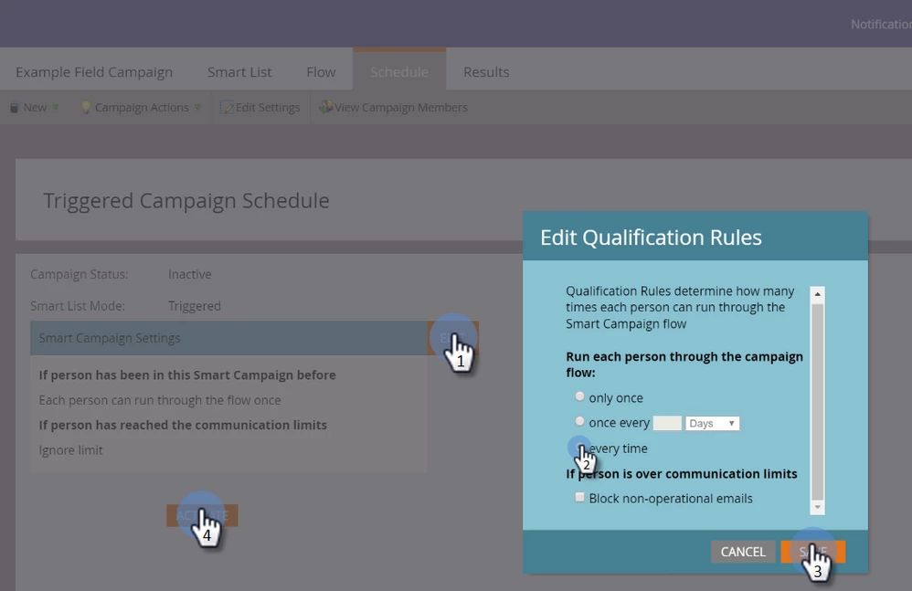 Finally, under the Schedule tab, edit the Smart Campaign Settings so this will apply every time, and Activate the campaign