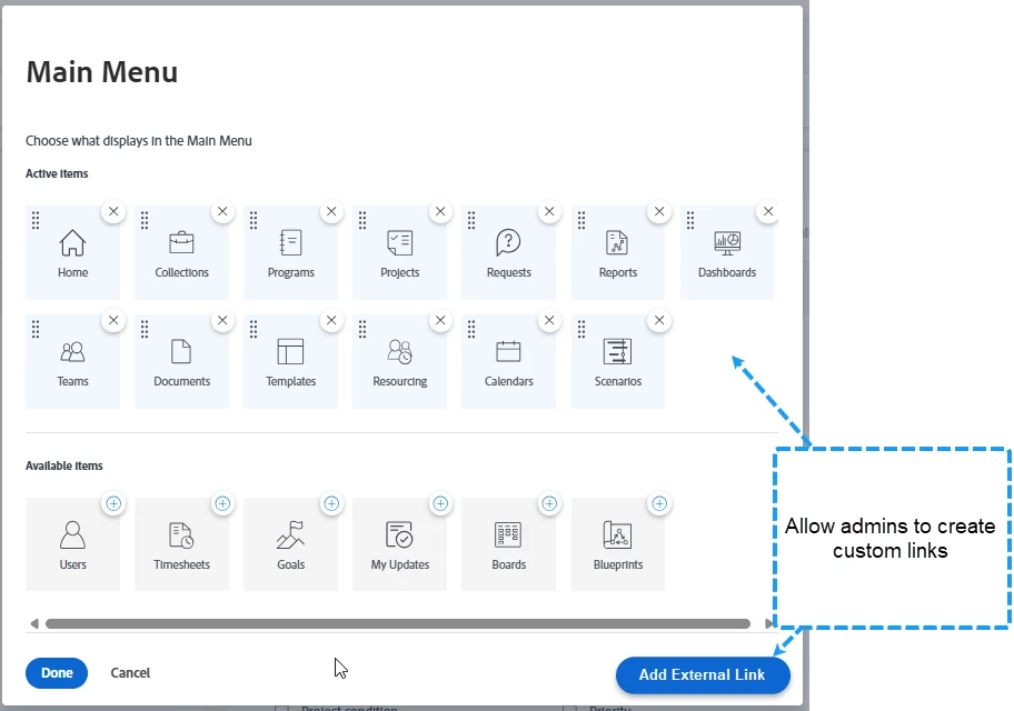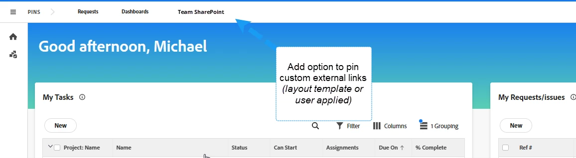 A great addition to Workfront would be the ability to add external links via the Main Menu or Top Navigation bar that could be set via layout templates or by the user (custom pins for top navigation).