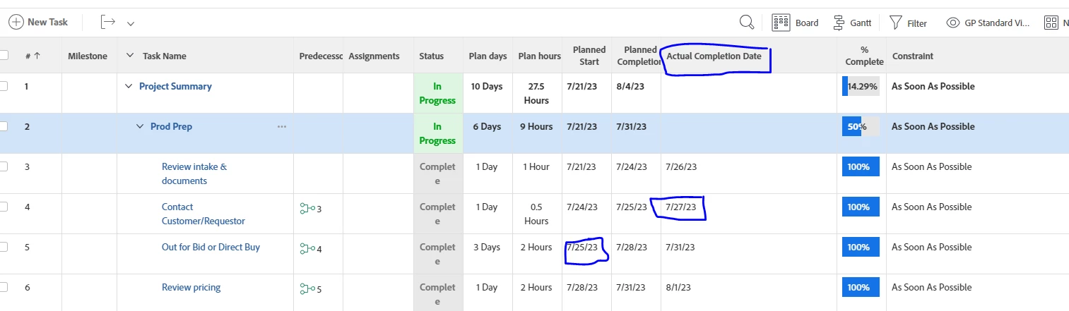 So for example, the planned start date is 7/21, The planned completion date is 7/24 but the actual completion date is 7/22 (added manually). It doesn't change the planned start date in the next task with predecessors.