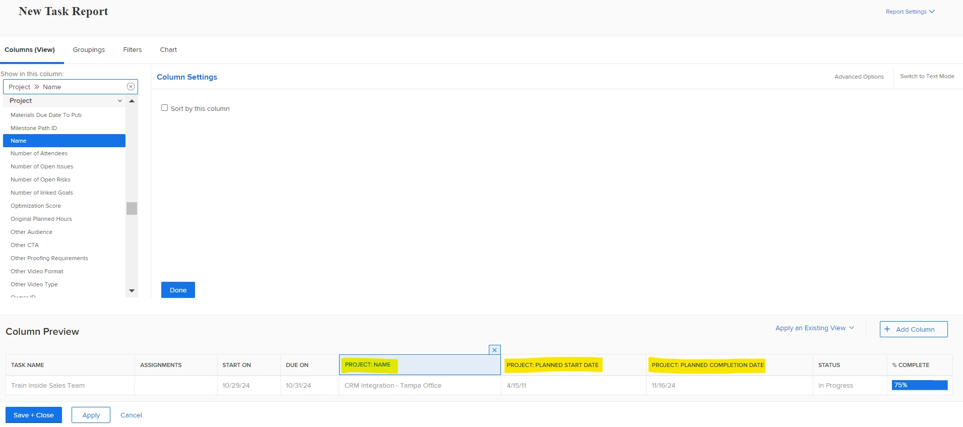 Add a Column to a Report to show specific task due dates