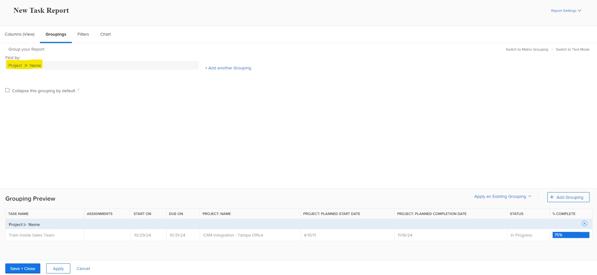 What i want is to have a report where a single project is on a row.
