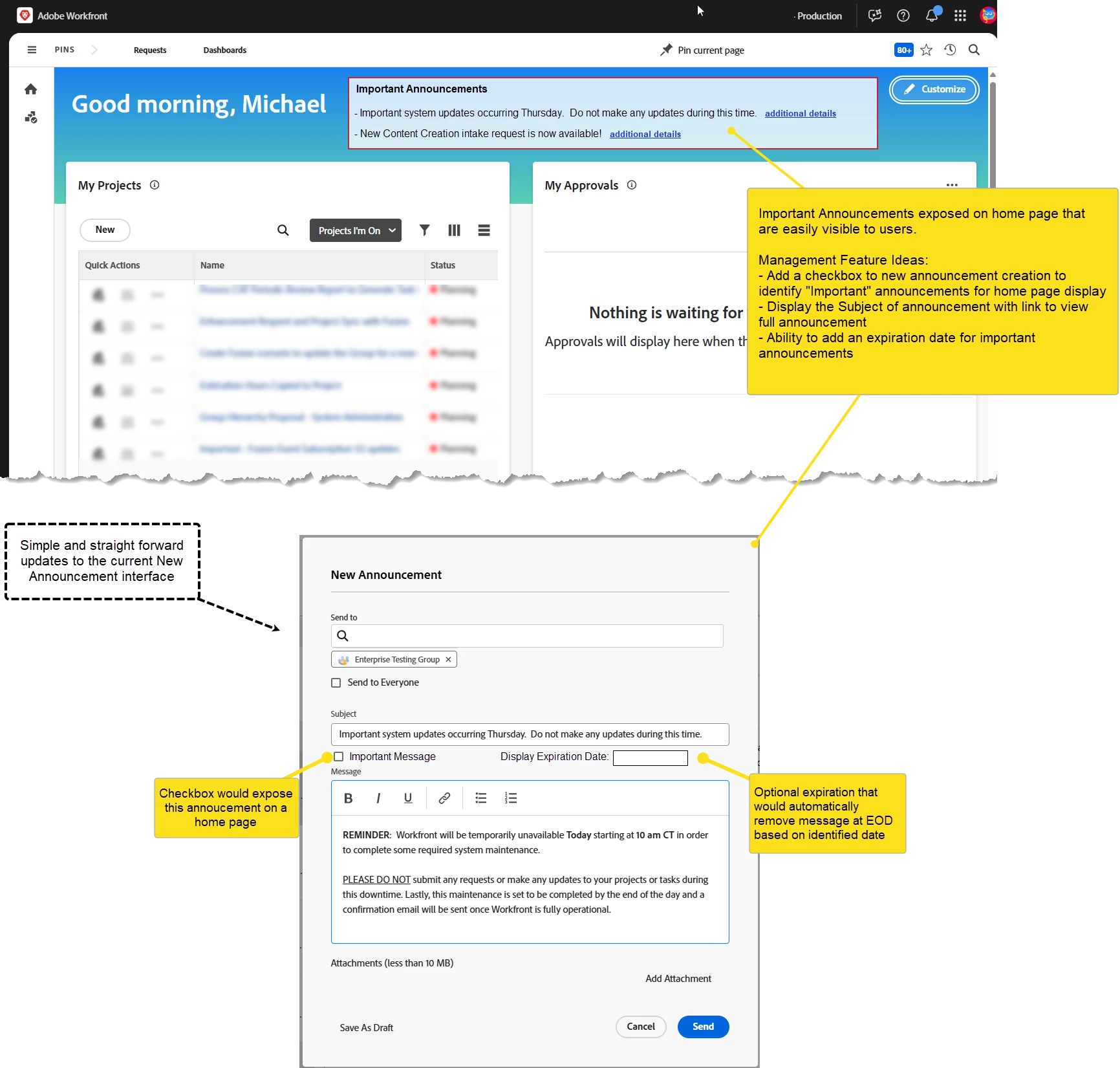 Idea: Add an "Important Announcements" section somewhere that would display important announcements that otherwise might get lost and overlooked. This could be the home page or potentially somewhere up top to account for layouts that maybe don't use a home page landing area.