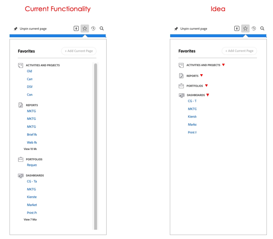 Description - Add in a carrot dropdown icon option next to each object header title within the Favorites and Recents menus