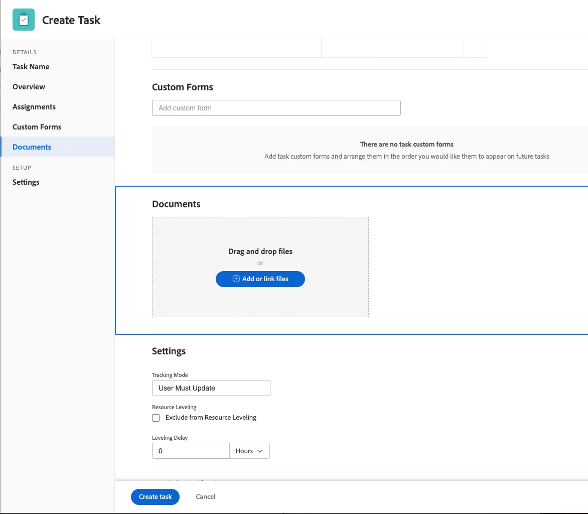 Description - When converting a request to a task or project, the user would see the documents section that is typically available to the requester during form submission. This would allow the user to quickly drag and drop any additional files that were not uploaded when the Request was first submitted. They could do this after the Project is created, but that involves a few more clicks around the interface and this would be faster.