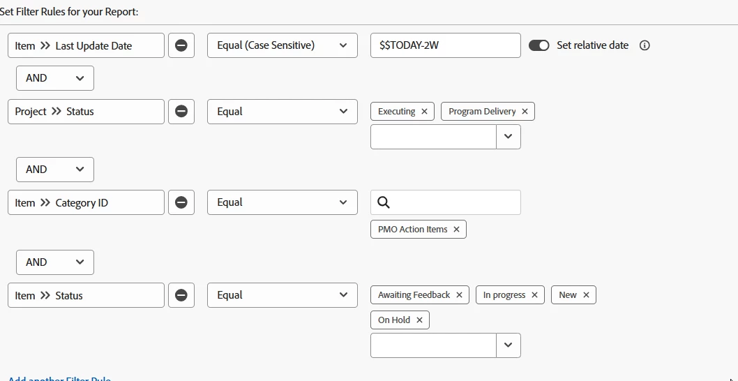 I am creating an item report to show all action items of projects in executing and program delivery status (CUR and ZLH) that have not been updated in more than 2 weeks.