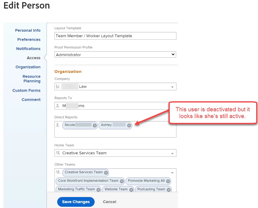 Description – When an account is deactivated, it should be hidden from relevant sections, i.e., Teams, Groups, Reports To, Direct Reports, and any other similar sections/fields.