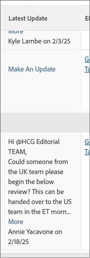 I am trying to create a project task view where I have a column pulling in the latest update/comment on its related task. Could anyone assist me in doing this?
