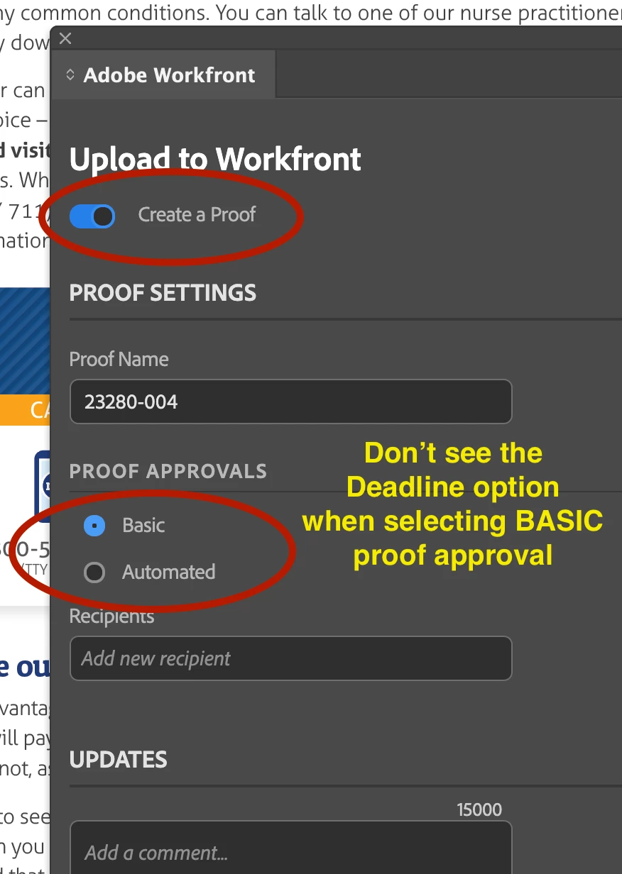 Currently there is a proof deadline option when selecting "Automated" Proofs but not for "BASIC" Proofs. Since the proof does not have a deadline date when deployed you have to go back into the Workfront system and edit the details within the "Proofing Workflow" with a deadline date. Making the plug-in useless when using "Basic" proof approvals if you want a deadline. See attached visuals.
