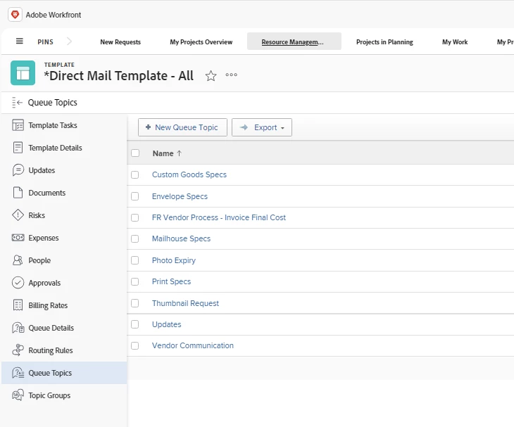 We use Workfront to convert requests (issue/specs) into projects using various templates. In our templates, we have Queue Topics set up to automatically add different issue/specs to the project based on the requirements. Ex: Issue/spec for Print Specs if it is a project converted with a Print template, etc.