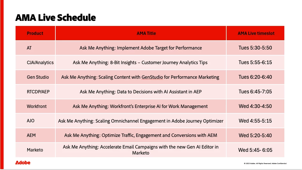 The Experience League team is bringing the AMAs out of Community and to the stage! There will be 8 AMA Lives focused on specific lab or breakouts to "continue the conversation" with the product teams after their sessions.