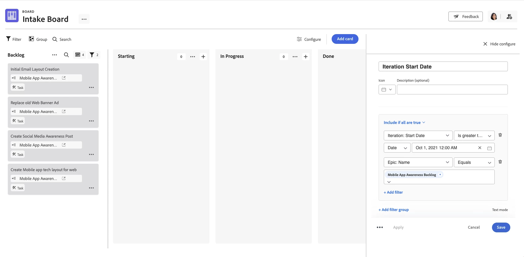 Both of these Agile boards should have the ability to drag and drop tasks to and from the Backlog, and between current Iterations or future Iterations. This will allow iteration planning without jumping between screens and views, so iteration planning meetings will go faster and feel less cumbersome.
