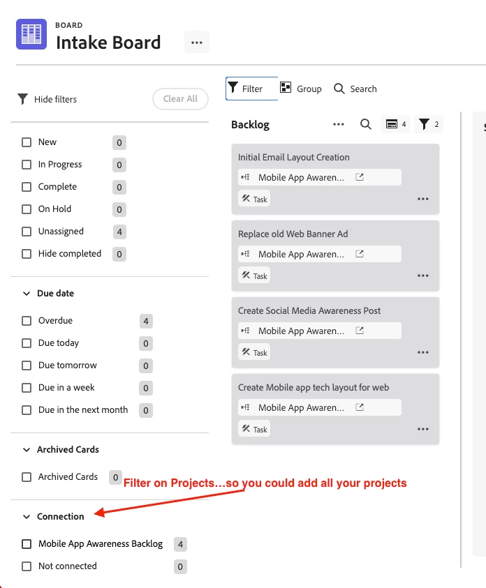 b. BY PROJECT: A board to show tasks within a project. New tasks go into the project backlog. This will allow projects to managed in a agile fashion without being built in a waterfall project plan. When a task is assigned to a resource, it would be on the project agile board, but also appear on that person's team board. Project tasks can be planned at the project level on this board. Burndown chart should show velocity for all iterations of the project and predict project end date based on velocity and remaining tasks.