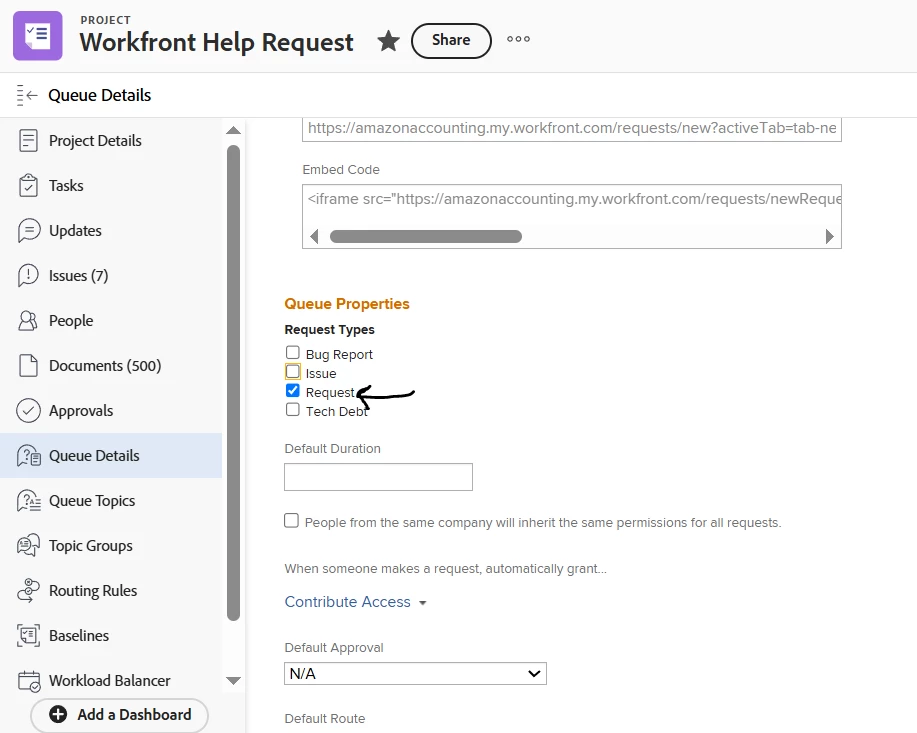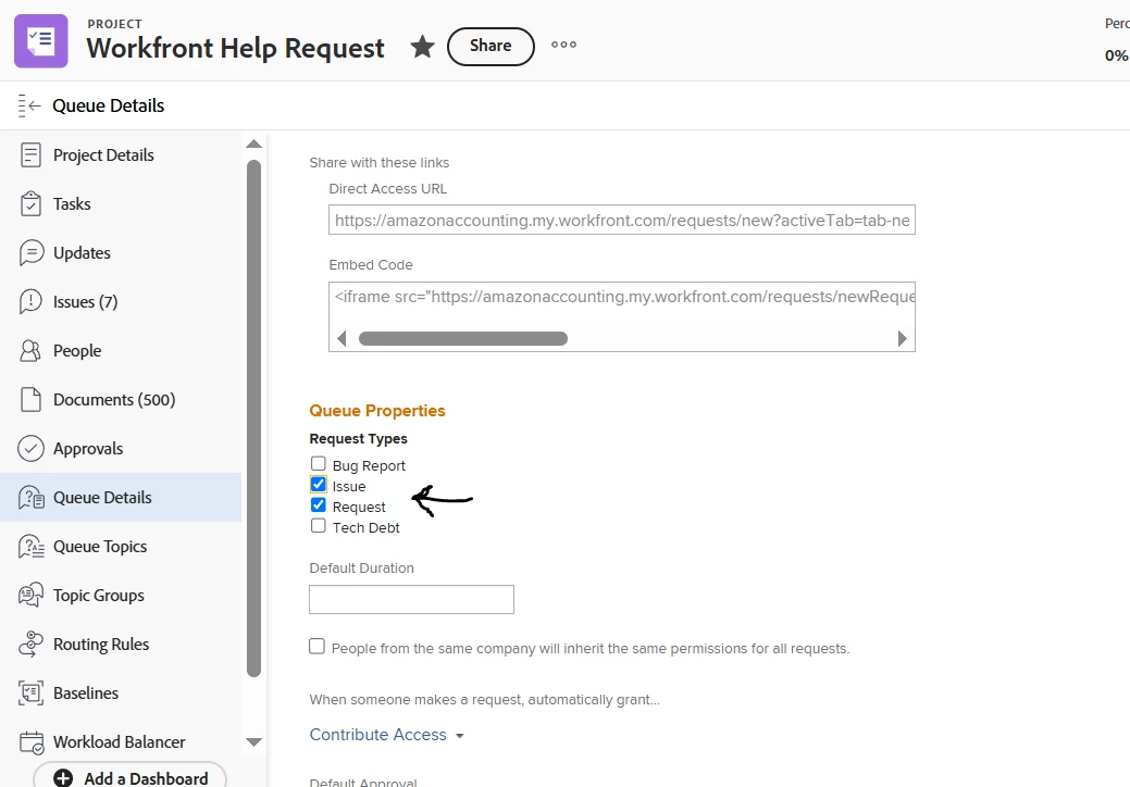 3. Go back to Queue Details and uncheck Issues.  only Requests is selected.  Make sure to Save.