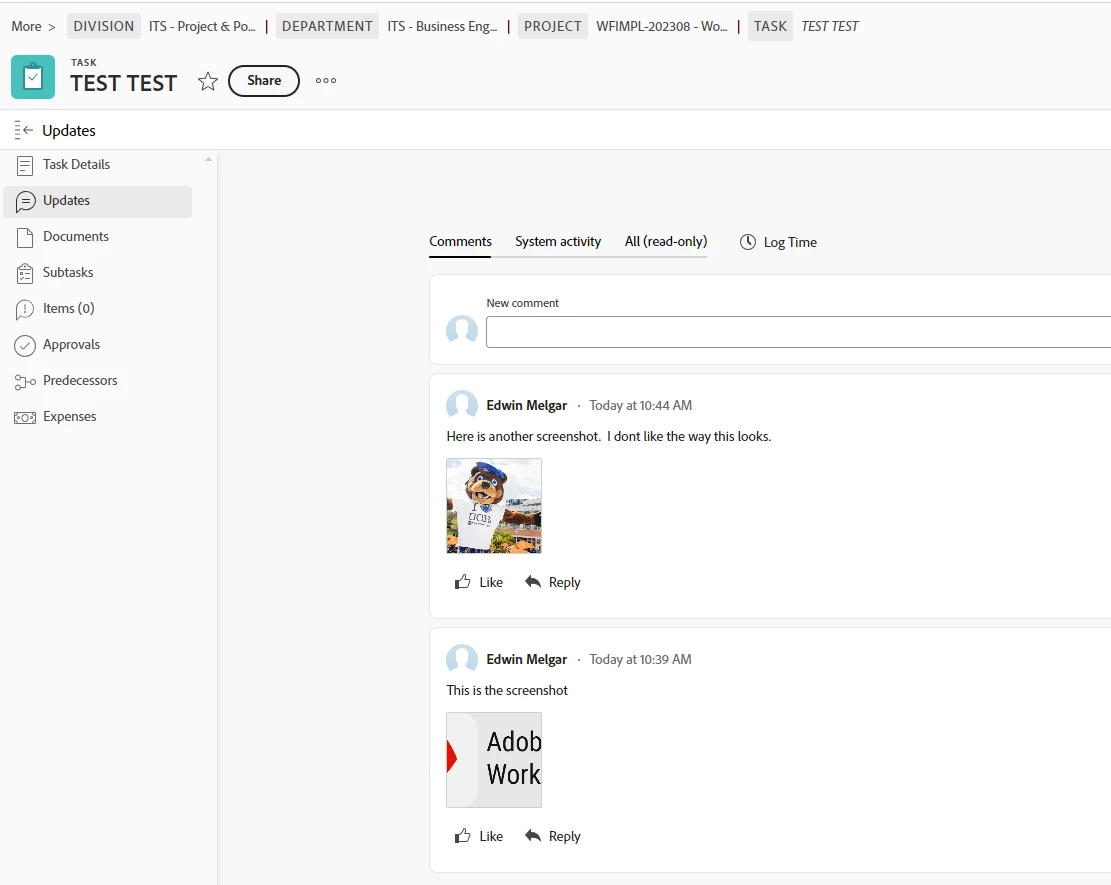 Description - Workfront allows you to attach files in the Updates section of an object (Allow users to add images in updates setting must be turned on), the attachment shows in the update feed. However, the document is not saved in the source object Documents tab.