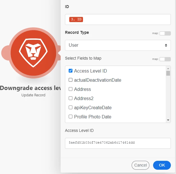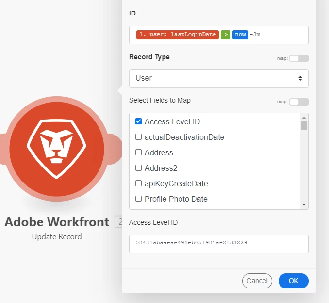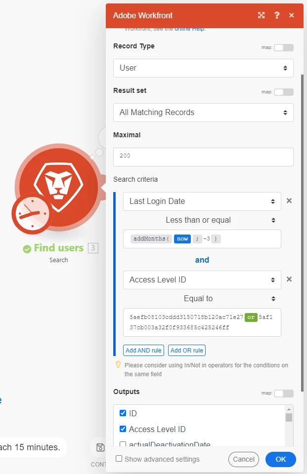I'm trying to automate my WF license change so that if the user has not been active for the past 3 months, it will automatically change his or her license to "Requestor." I'm running a scenario in Fusion to make this possible, but I'm not sure if my conditions and fields are correct. I would like to ask for some suggestions on how to run this. This is my first time using Fusion, and I'm a little perplexed by all the modules I've configured and am attempting to self-learn.