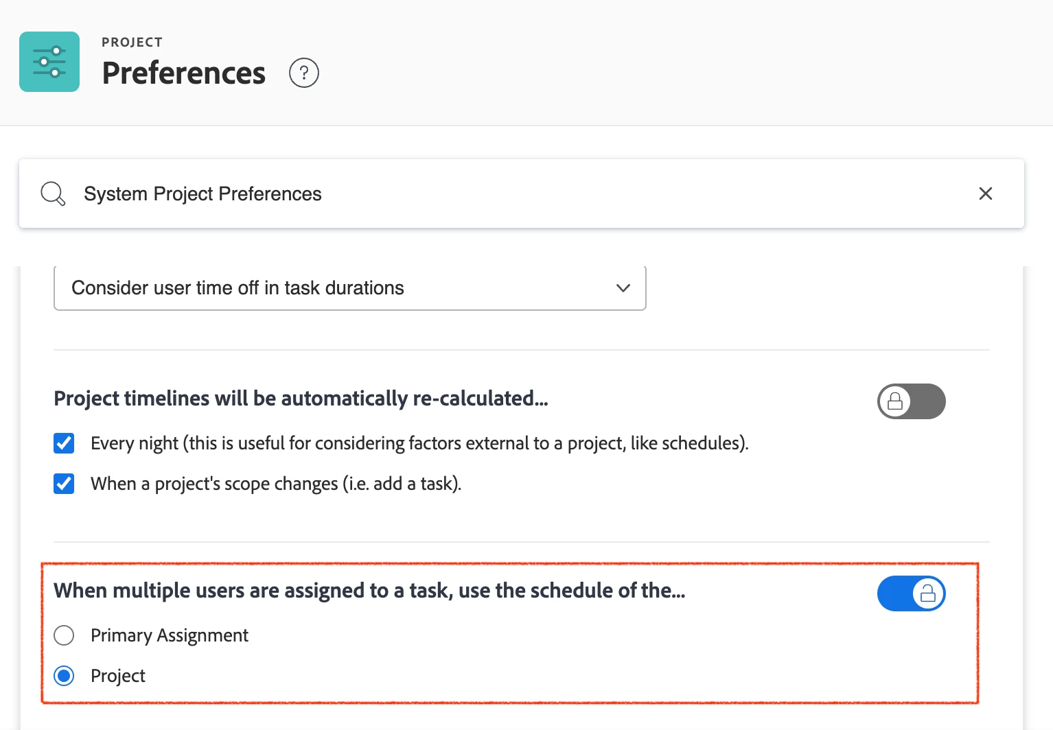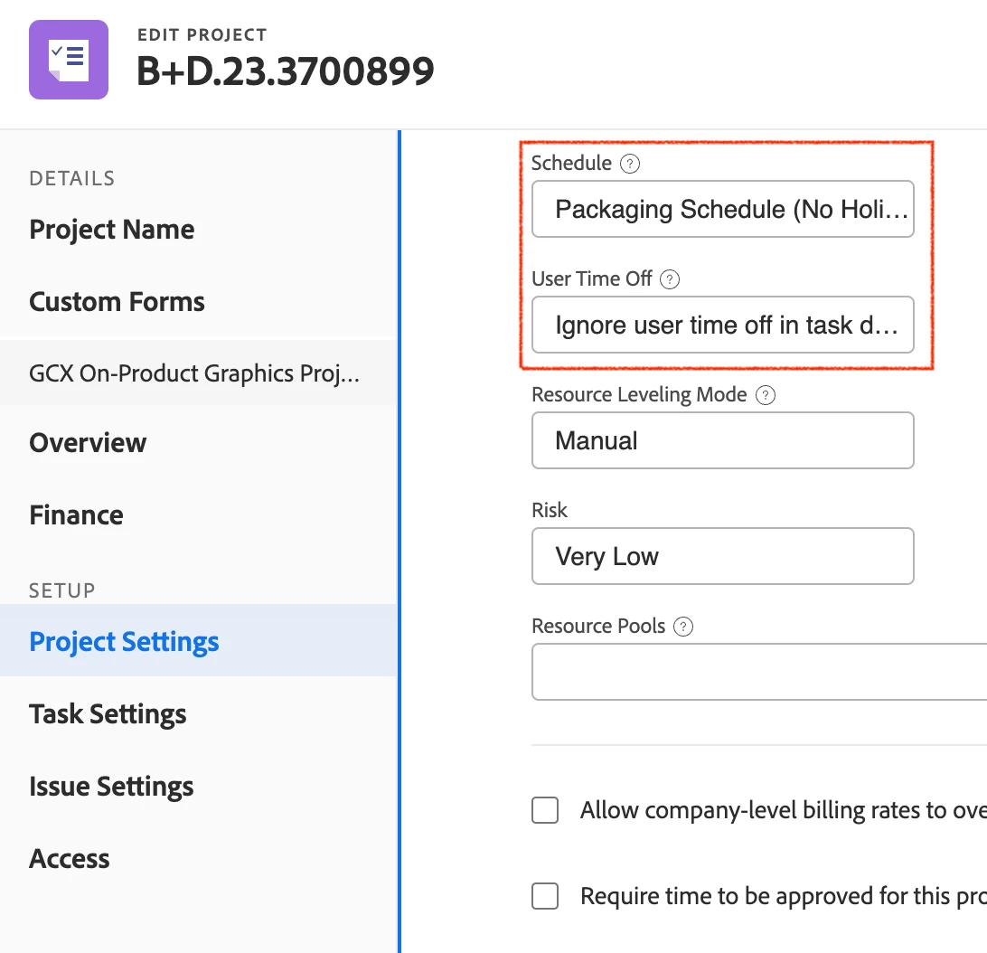 - We have set Project Preferences to Consider user time off in task durations for all projects.