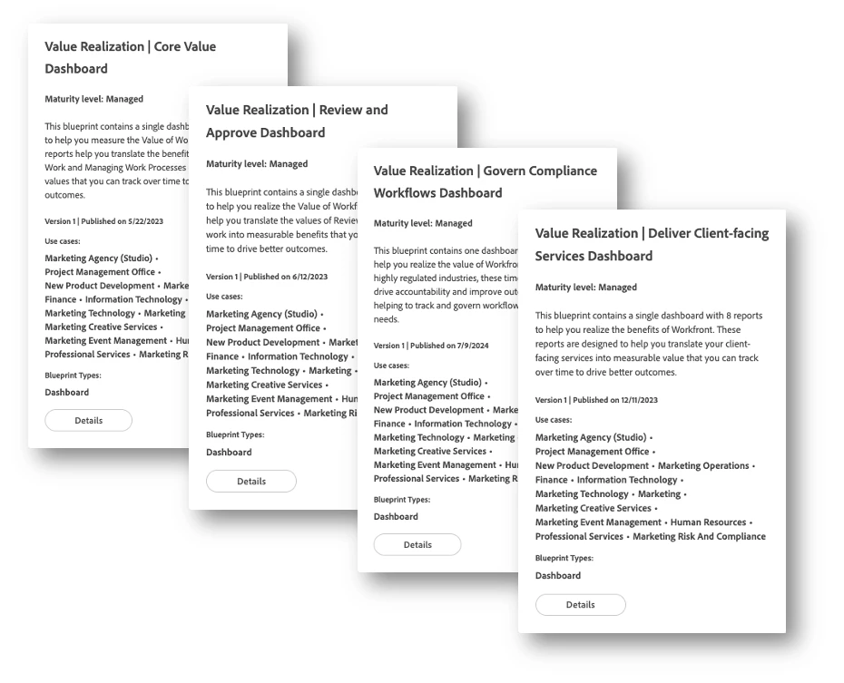 This bundle will help you realize the value you are getting from Workfront AND be able to share the outcomes with stakeholders in a meaningful and measurable way. Adopting the Value Realization Blueprints means you will have an instant view of recommended metrics that provide visibility into how work gets done.