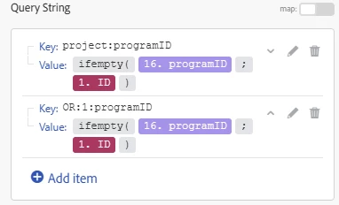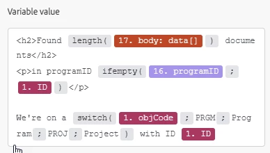 We need to search arguments: DOCUs on the program itself, and DOCUs in any of the program's child projects. The programID might come from the webhook, or from the upper branch - so we just say "if one is empty, use the other". Since the ID in the webhook is always set (it's a projectID or a programID) we use it as the fallback argument in the ifempty statement. In English this means, "Use the programID from the lookup, unless that's blank - in which case use the ID the webhook received".