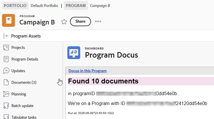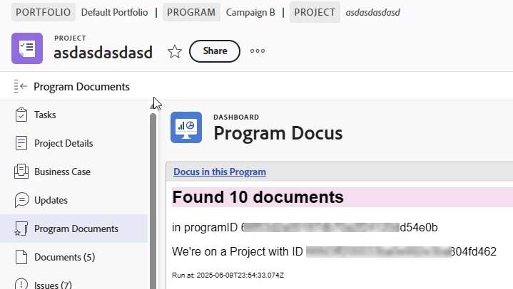 Let's now use real Workfront data using that use case of displaying project documents under a program. The use case is that on any given project, the user wants to check if a certain document was already attached to the program or any project in it. If it exists, no need to recreate it.