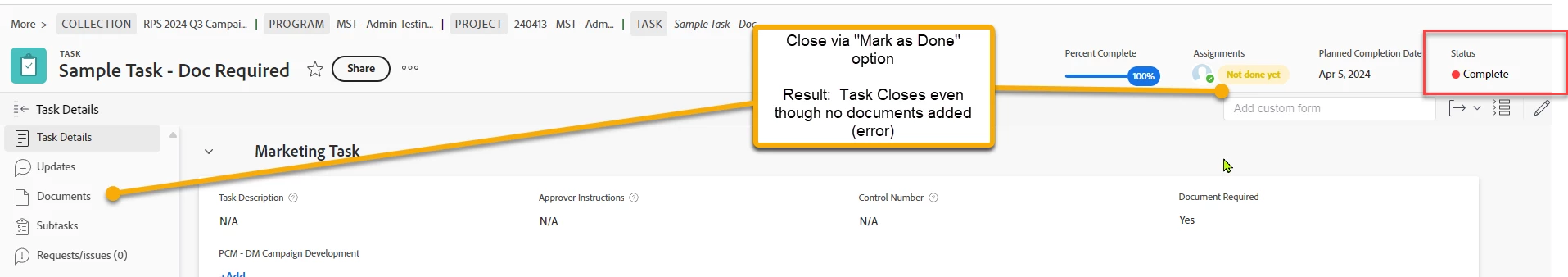 Closed via Mark as Done and the task closing without document (error we are attempting to prevent)