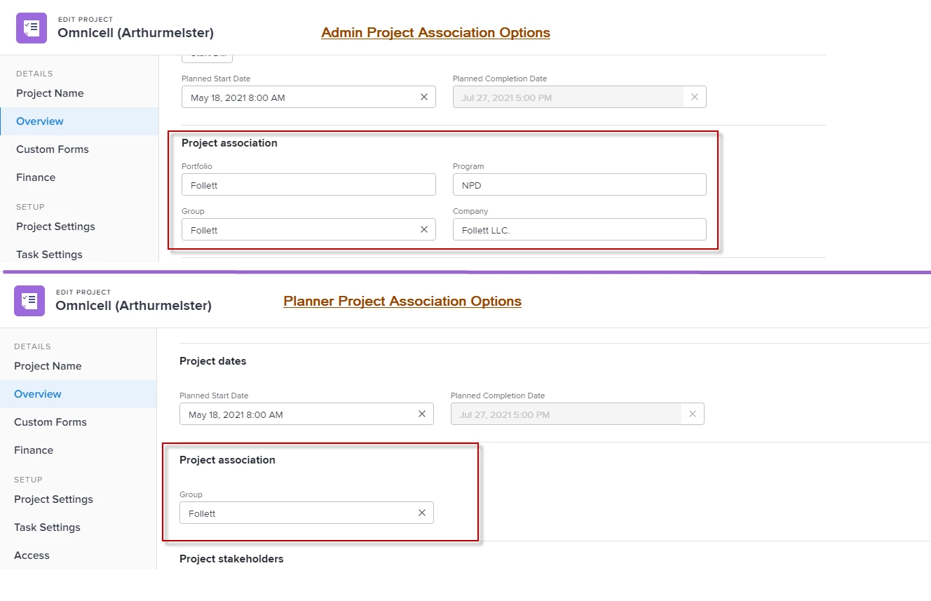 I had one of my planners question why he did not have access to assign a portfolio, program or company to a project. He says he used to be able to and now he can't. As an admin, I was able to assign them when editing the project. I logged in as the planner and the options to assign a portfolio, program and company did not appear. He only had the option to assign a group.