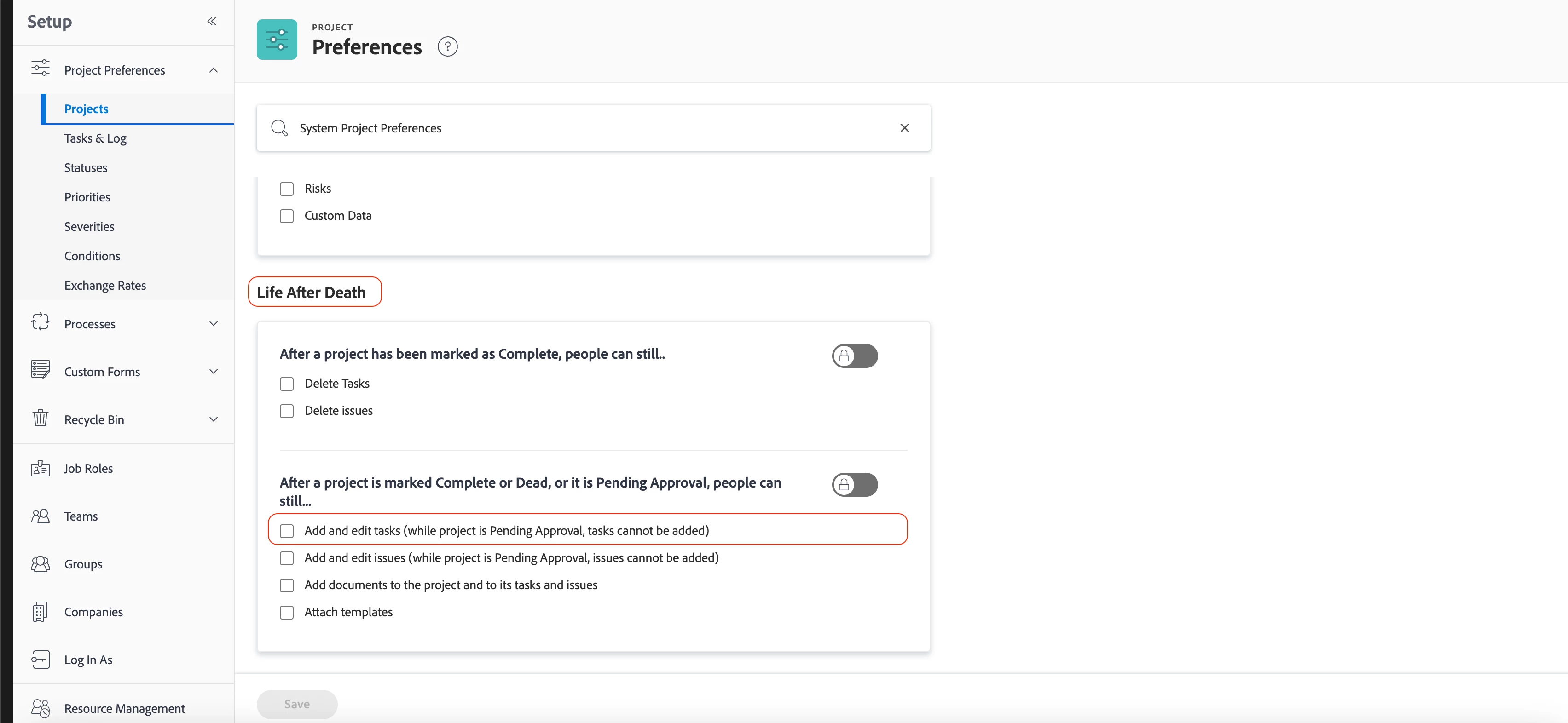 2. In Setup, select Project Preference > Projects > Life After Death.