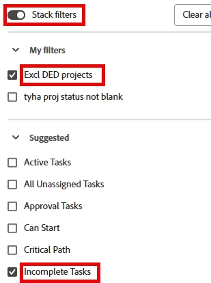 and in the widget filter, turn on "stack filters" and select both "incomplete tasks" as well as "exclude DED projects"