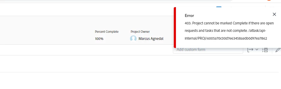 If you don't see any "open" tasks or issues/requests on your project, add a column for Status to your task and issue list views. You may have a task or issue that is marked 100% but has a status of Complete - Pending Approval.