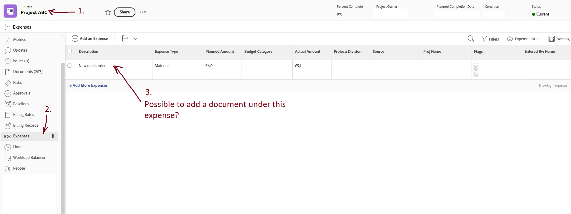 Can we attach a document for a expense under "Expenses" tab in a Project? Any solution?