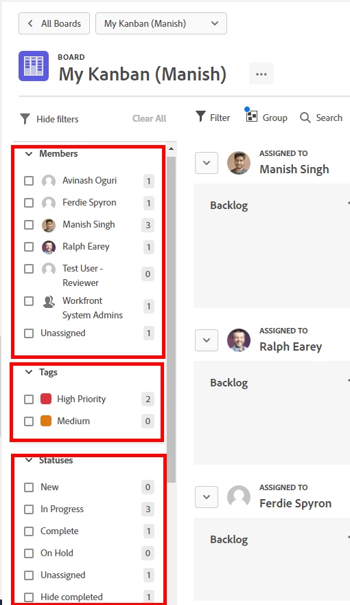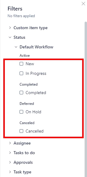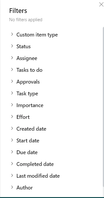 Description - The image I'm sharing below is from another PPM tool which gives an option to categorize filters based on field type. The category/folder name turns from black to blue when a filter is applied within that category making it easier to identify filters applied. It also has "Clear All" option. Having this feature will be a plus point for users.