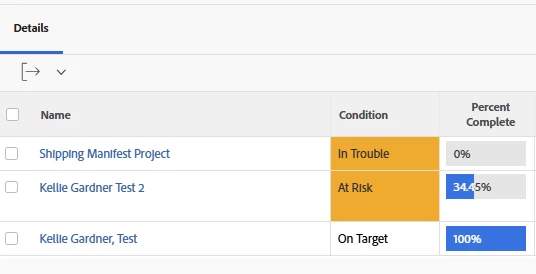 So, the one At Risk should be highlighted orange but the one In Trouble should not be highlighted red, as Percent Complete = 100.