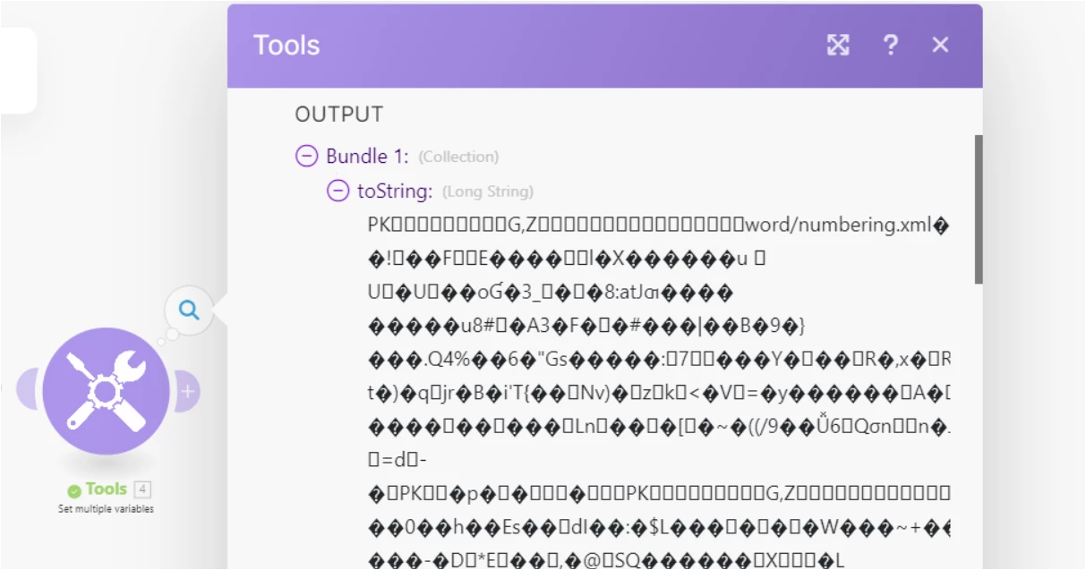 I ask because the Download Document module for Workfront only outputs the raw data available; this is the strange string with lots of unreadable characters. The module is meant to retrieve the document and serve as an aid to move it from Workfront into another application (for example, move a document from Workfront into Google Drive). The module is not meant to be retrieved from Workfront and then read in Fusion.