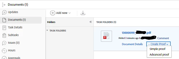 I have a process where I load a .pdf as a proof and then convert that to a task against the correct project. After I do this the proof options seem to be removed and I have to create a simple proof from the the document again. Is this expected? Ideally, I want the proof to remain a proof in the created task. Steps below: -