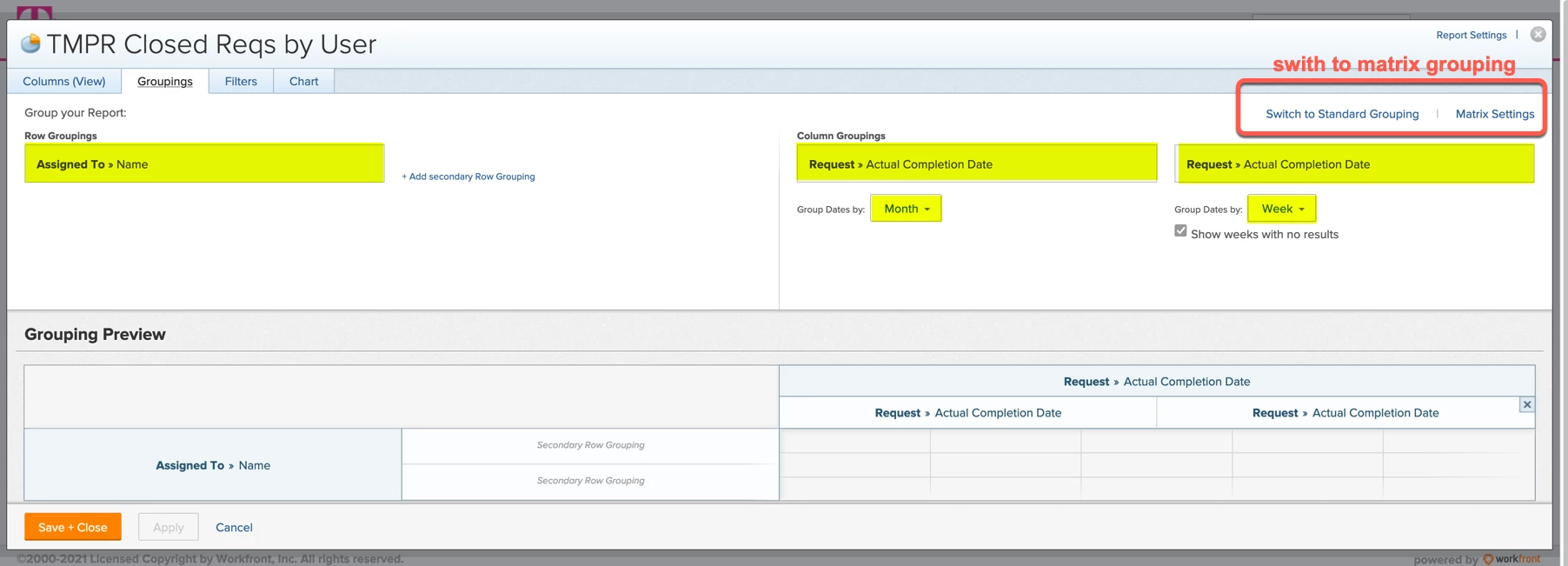How would I create a chart/report with the average requests completed by resource (Assigned To) by week and month?